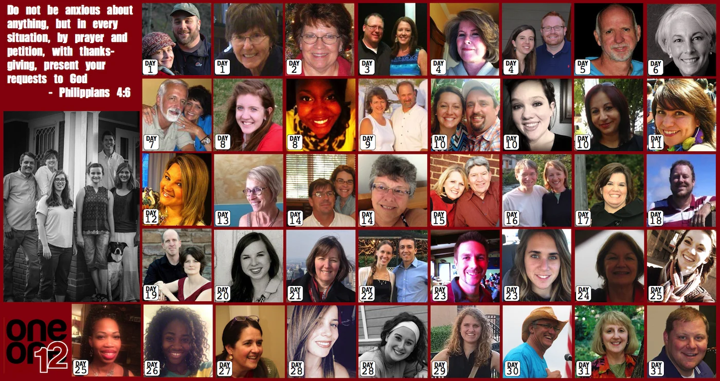 The picture above shows our AWESOME prayer team (as of January 2017). Each individual or couple has committed to praying on one particular day each month, for one hour, for 12 months (thus the "one.one.12" icon). They are obviously welcome and encouraged to pray for us any and every day but they have made a commitment to dive into deeper prayer on a particular day of the month. This helps to insure that someone is praying for us, in depth, every day of every month. Sometimes we have more than one person committed to praying that day and we would love to have a team of people praying every day. We know that these prayers bear amazing fruit in our lives and our work.